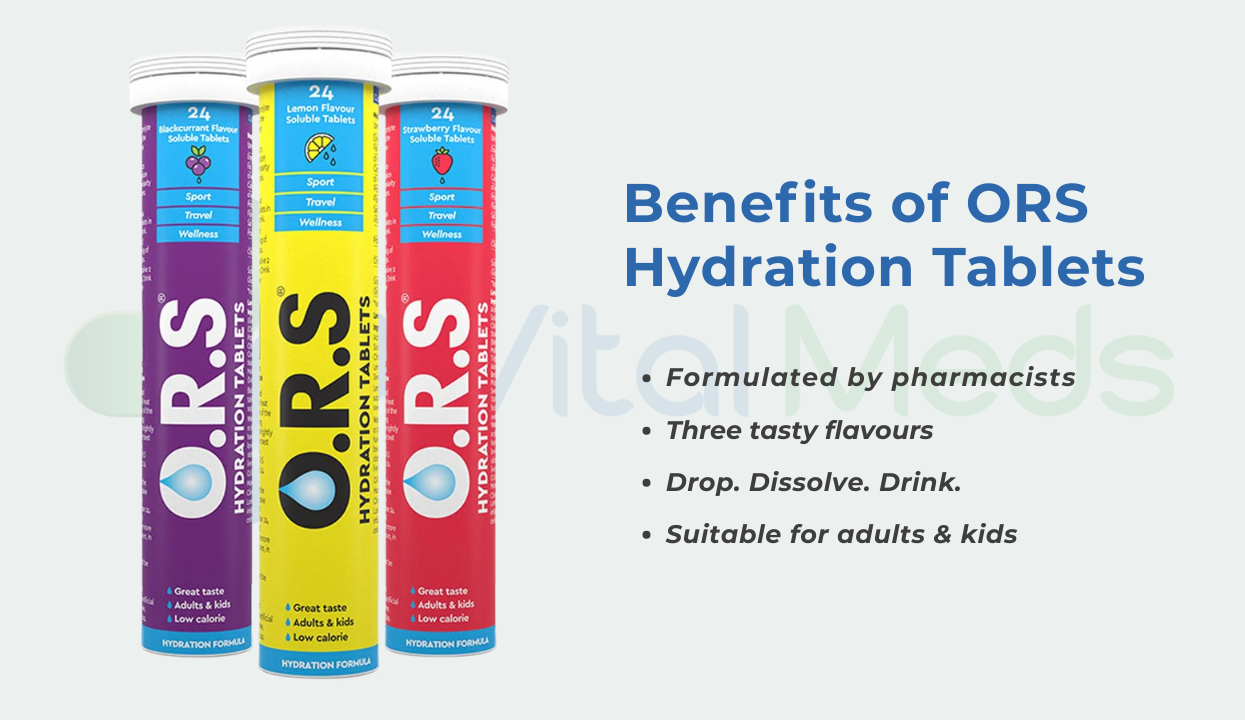 Dehydration may hit any person, including children and adults, during traveling, illness or heat. ORS hydration pills are a fast, safe, and convenient way of replacing the fluids and electrolytes.